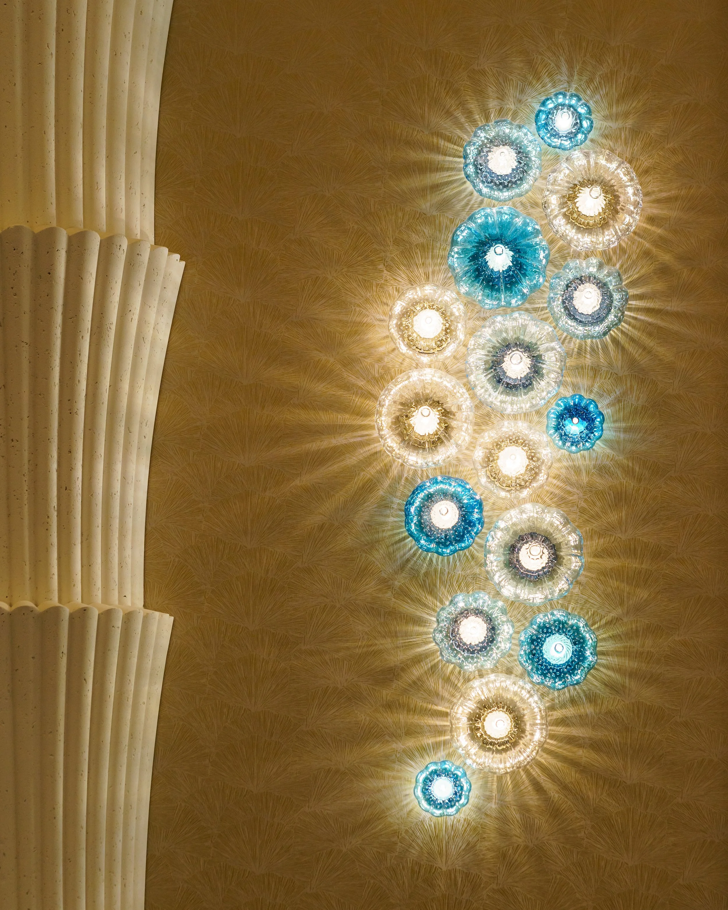 Sea urchins live in round shells, the fragility of which evokes the primary property of glass. The moment the lights come on, is when this installation comes to life. It is not only the urchin-inspired shape which stands out, but it is all the small details, such as the design of spikes
